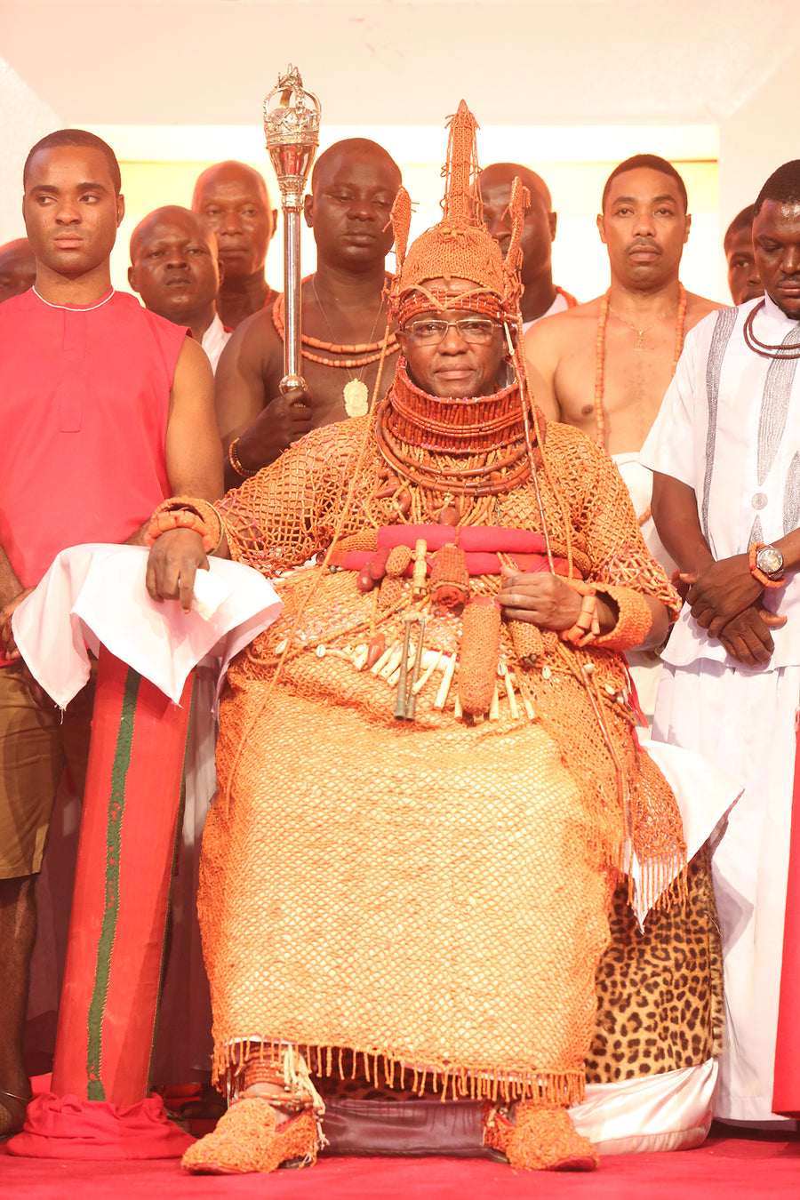 Ewuare II (born October 20, 1953). crowned the Oba of Benin on 20 October 2016 wears full suit made of coral stone beads.