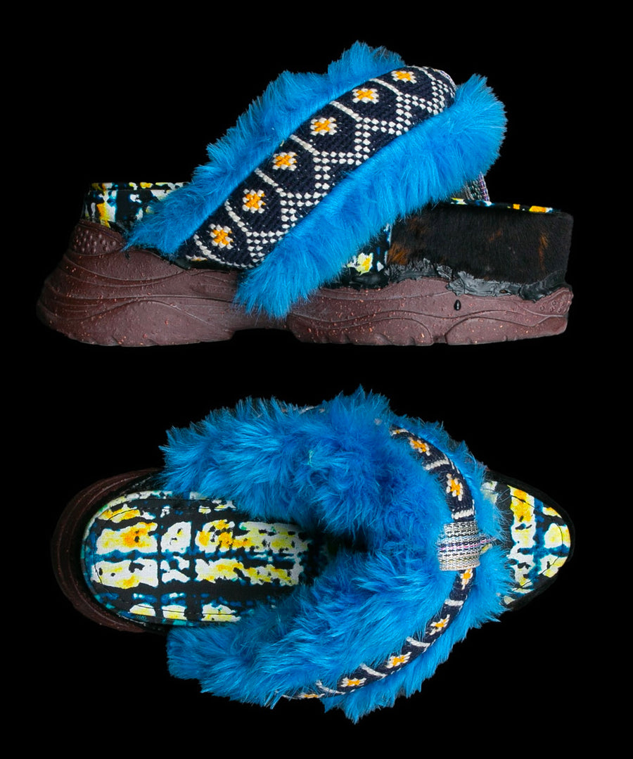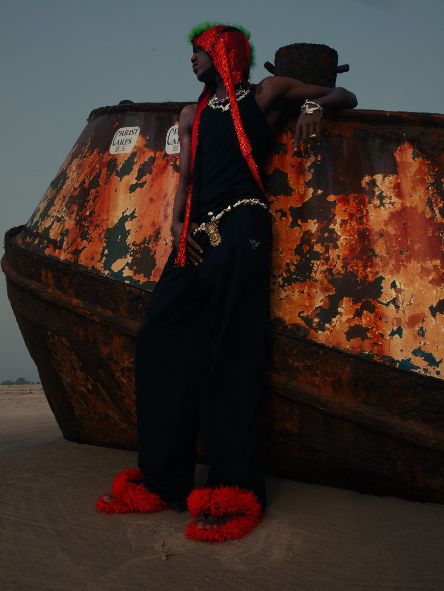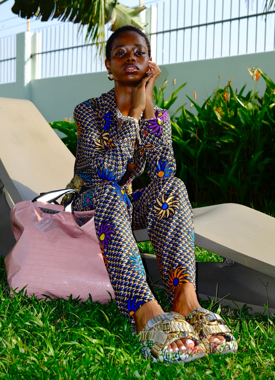 Crafted from fabrics found in Accra’s Kantomanto Market and Lagos’s Mushin Market, each piece blends foreign textiles with native craftsmanship. The collection becomes a vibrant expression of identity, where local tradition and external influences meet, creating designs rooted in both reclamation and renewal.